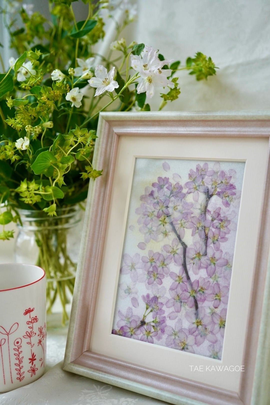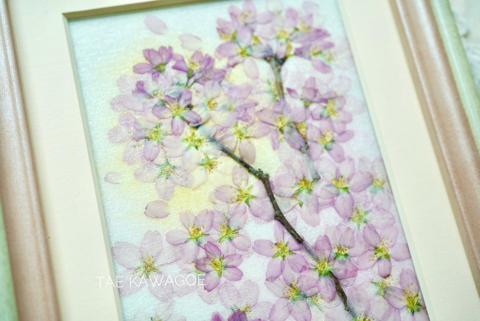 Tokai cherry blossoms and Keiou cherry blossoms and their branches are pressed without coloring. Cherry blossoms are relatively easy to press, but it can be difficult to determine the best time to do so. That is why I look forward to the cherry blossom season every year, saying "Thank you for blooming," and carefully press each flower one by one.