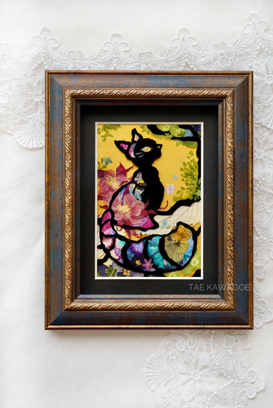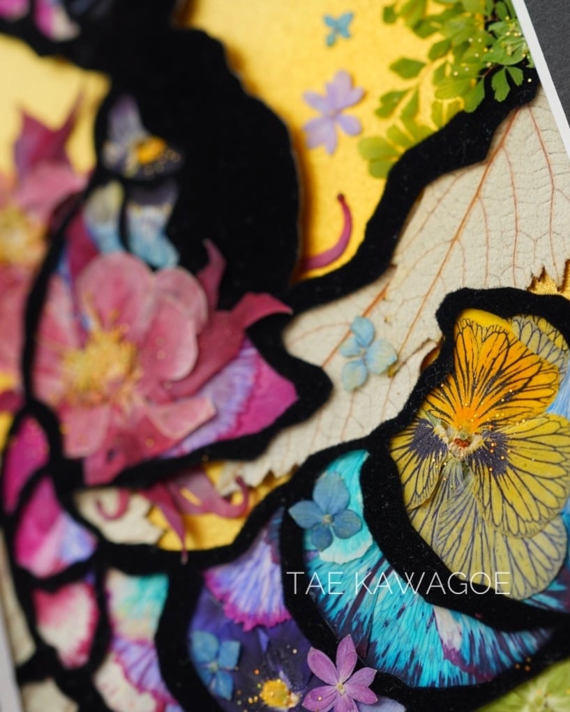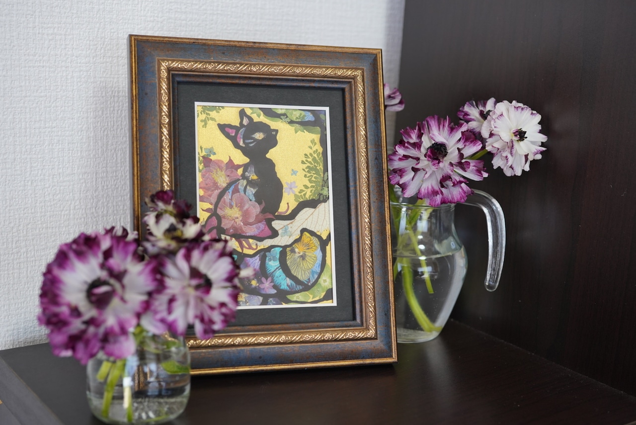 This work is sealed in glass. Pressed flowers are delicate and change over time when exposed to air or ultraviolet light. By sealing them in glass and blocking out the air, you can enjoy their beautiful colors for a long time. If you open the back panel of the frame, air may enter. When you receive it, please display it as it is, away from direct sunlight.