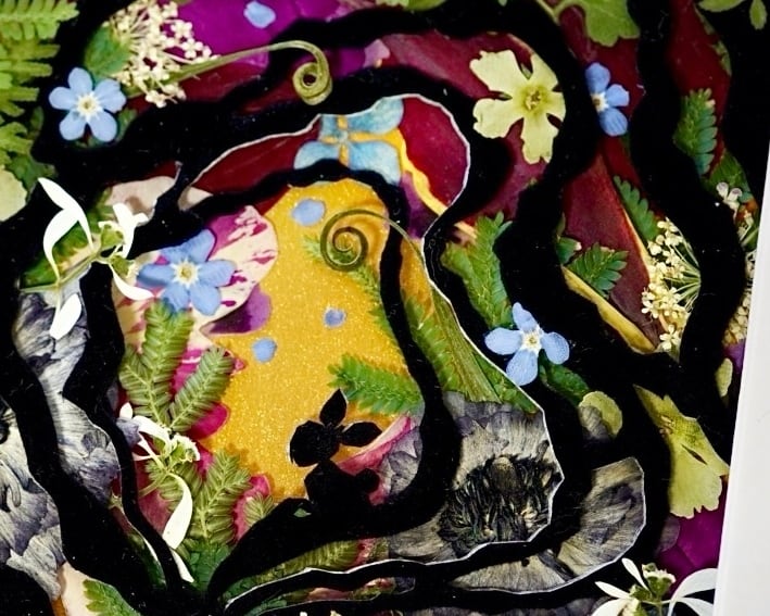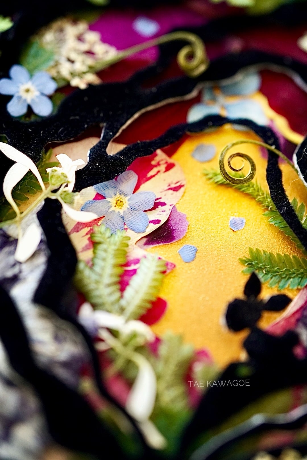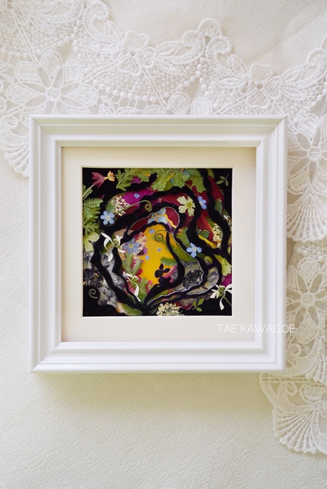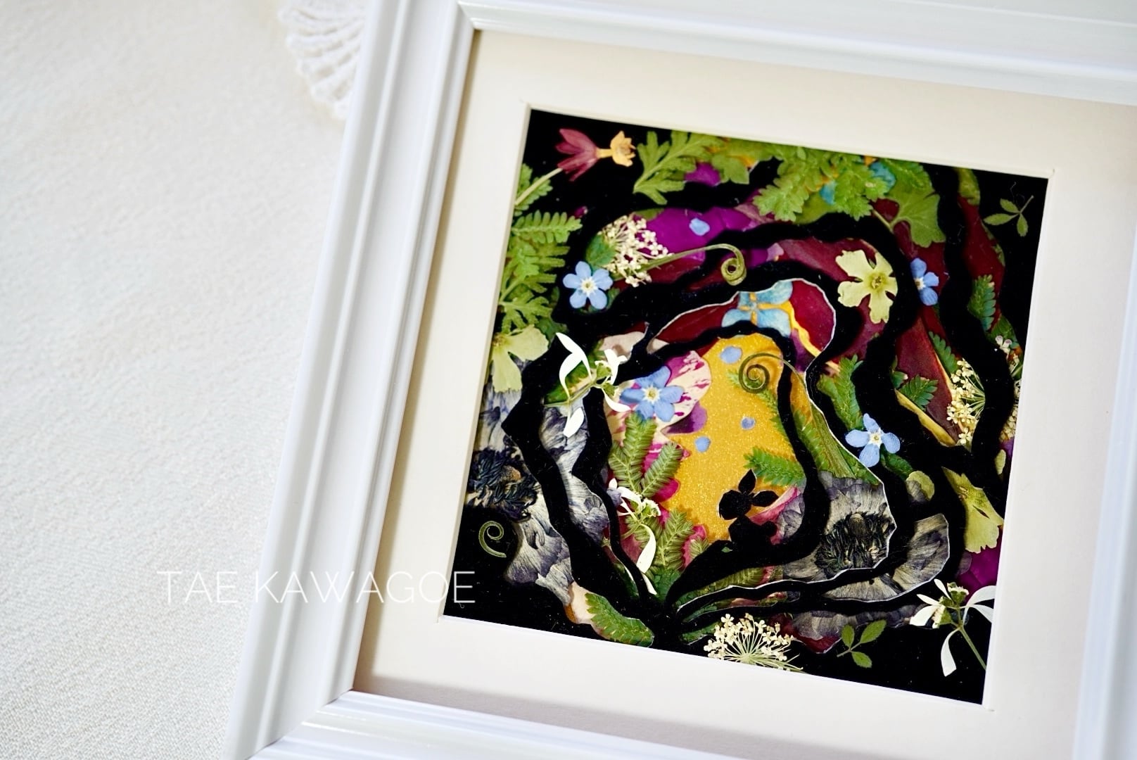 This work is sealed in glass. Pressed flowers are delicate and change over time when exposed to air or ultraviolet light. By sealing them in glass and blocking out the air, you can enjoy their beautiful colors for a long time. If you open the back panel of the frame, air may enter. When you receive it, please display it as it is, avoiding direct sunlight.