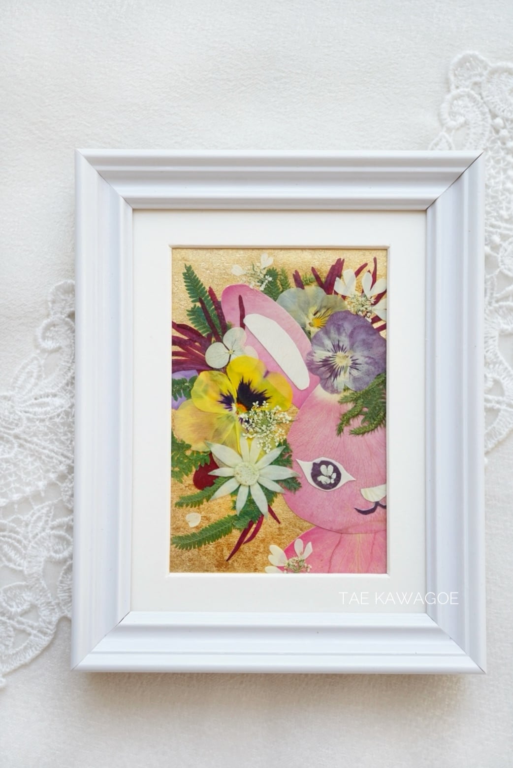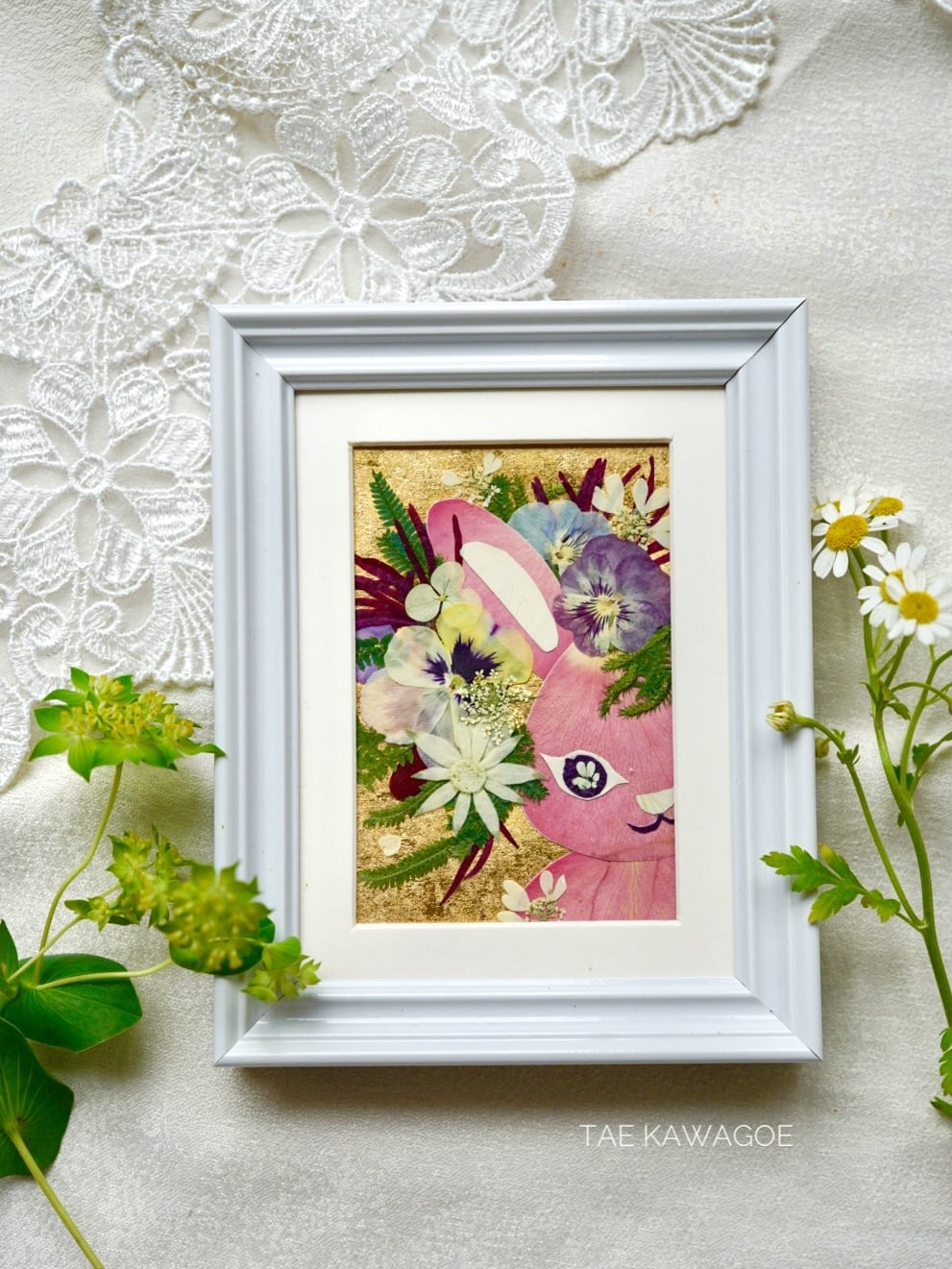 The pink rabbit's body, ears, eyes, and everything else were designed using pressed flowers. If animals were to play with flowers in the forest, it might look something like this. Using pressed flowers, I expressed the world of animals that resonates with the cycles of nature.