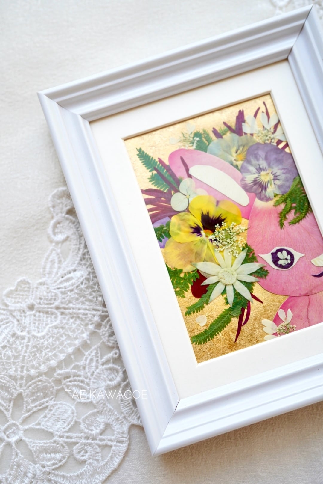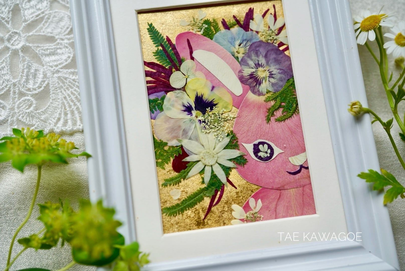 ピンク色のウサギの身体はもちろん耳や目など、全て押し花を使ってデザインしました。