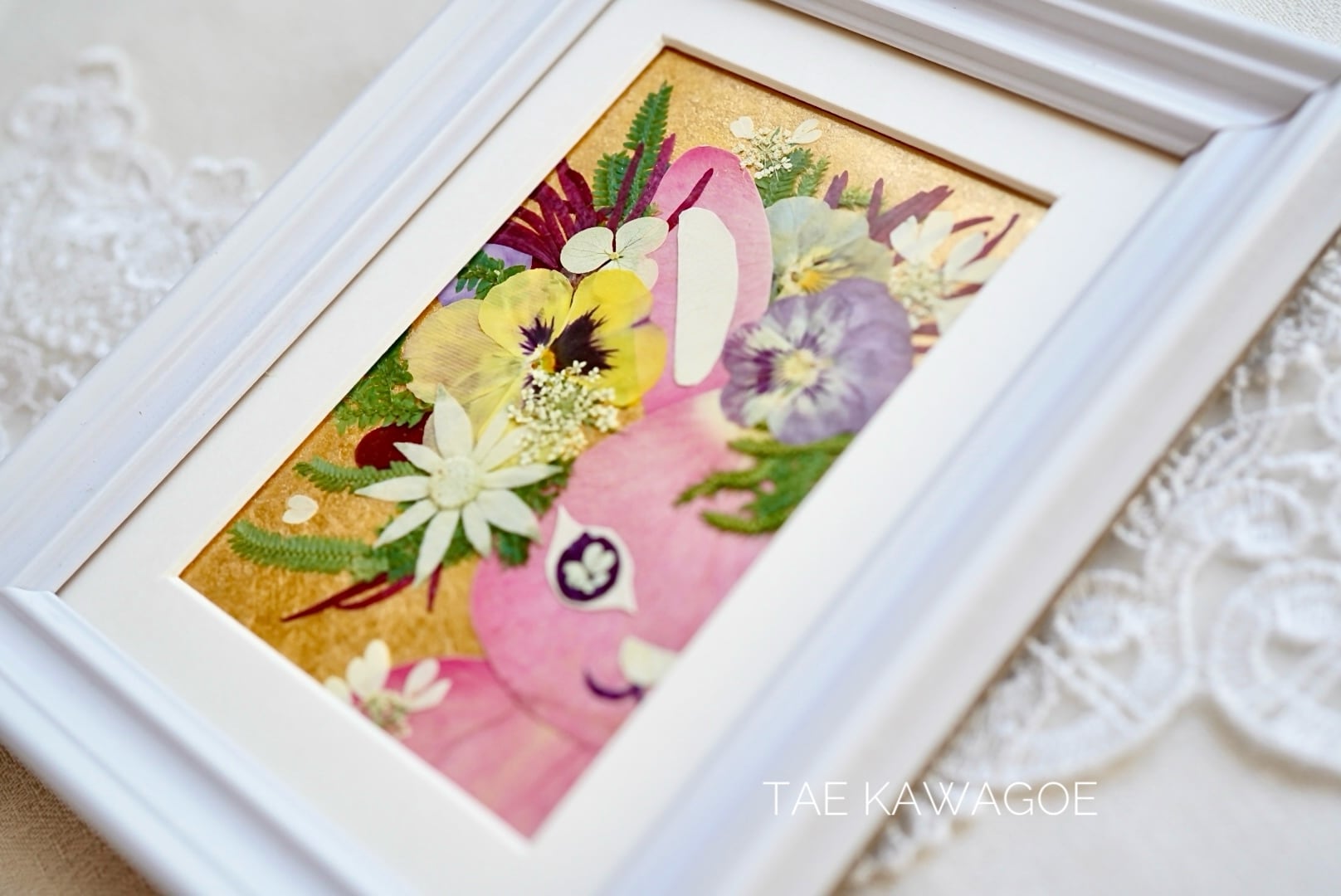 This work is sealed in glass. Pressed flowers have a delicate nature that changes over time when exposed to air and ultraviolet rays. By sealing them in glass and blocking the air, you can enjoy their beautiful colors for a long time. If you open the back panel of the frame, air may flow in. When you receive it, please display it as is, away from direct sunlight.