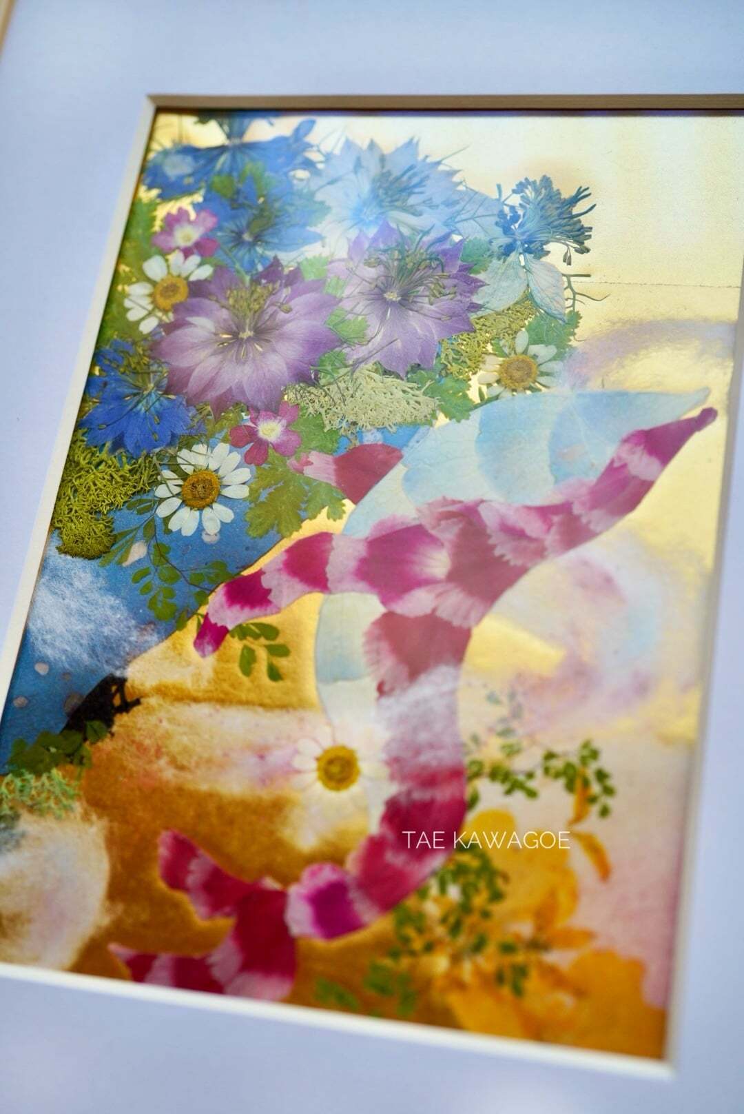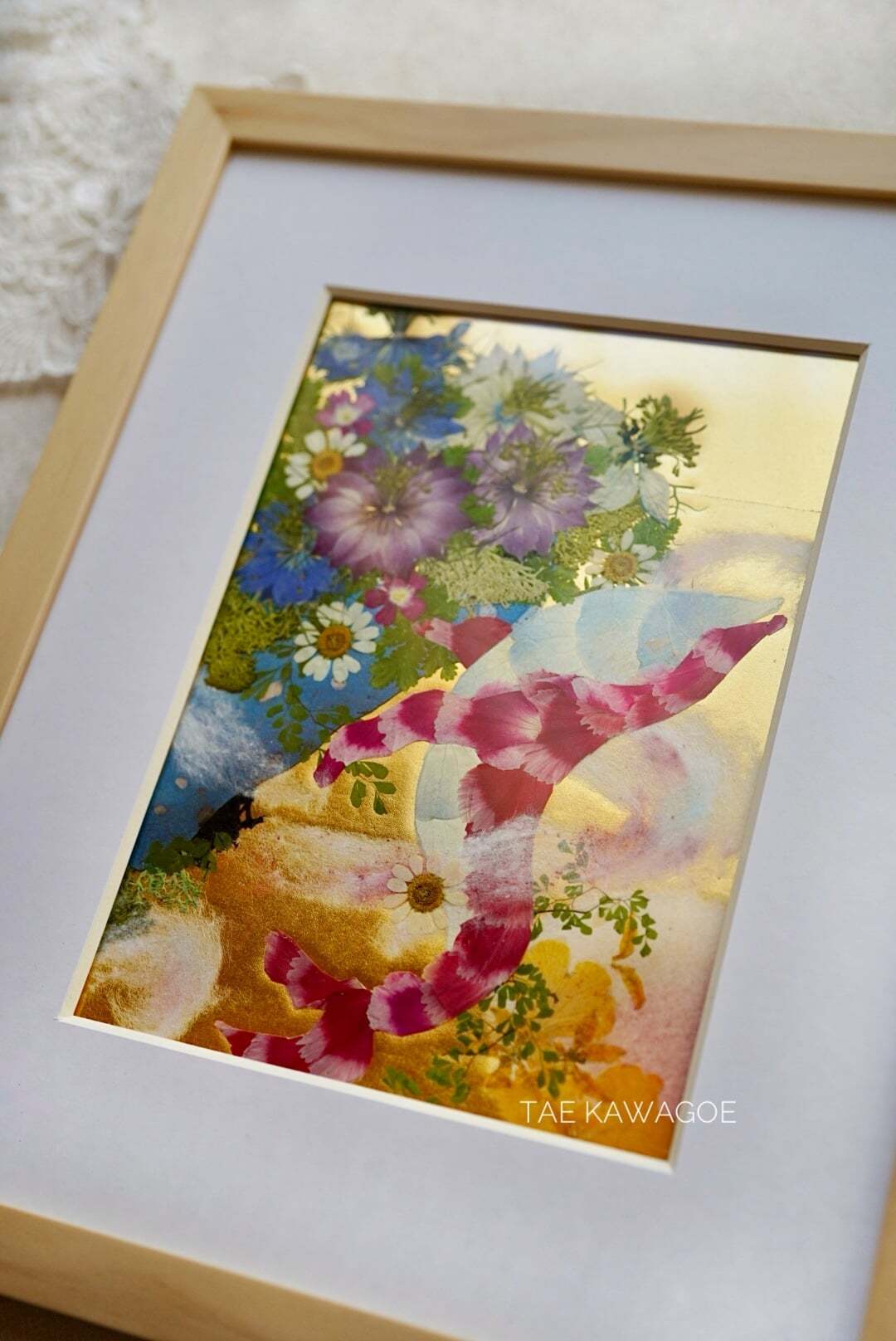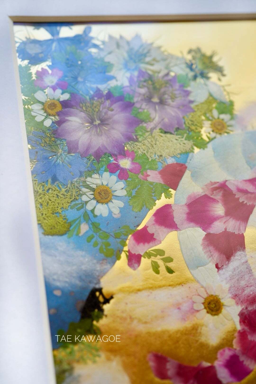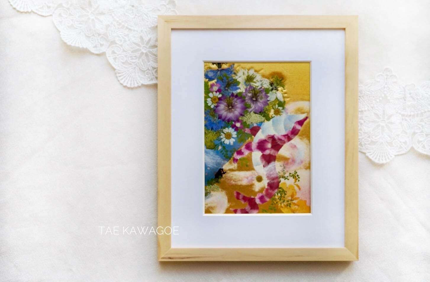 This work is sealed in glass. Pressed flowers are delicate and change over time when exposed to air or ultraviolet light. By sealing them in glass and blocking out the air, you can enjoy their beautiful colors for a long time. If you open the back panel of the frame, air may enter. When you receive it, please display it as it is, away from direct sunlight.